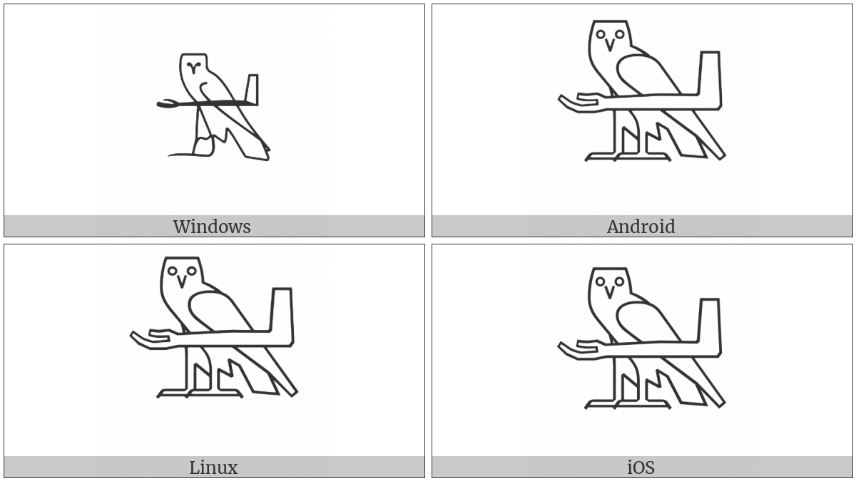 The image below shows how the “Egyptian Hieroglyph G020” symbol might look like on different operating systems. If the font in which this web site is displayed does not contain the symbol and there is no fallback font able to render it, you can use the image below to get an idea of what it should look like.