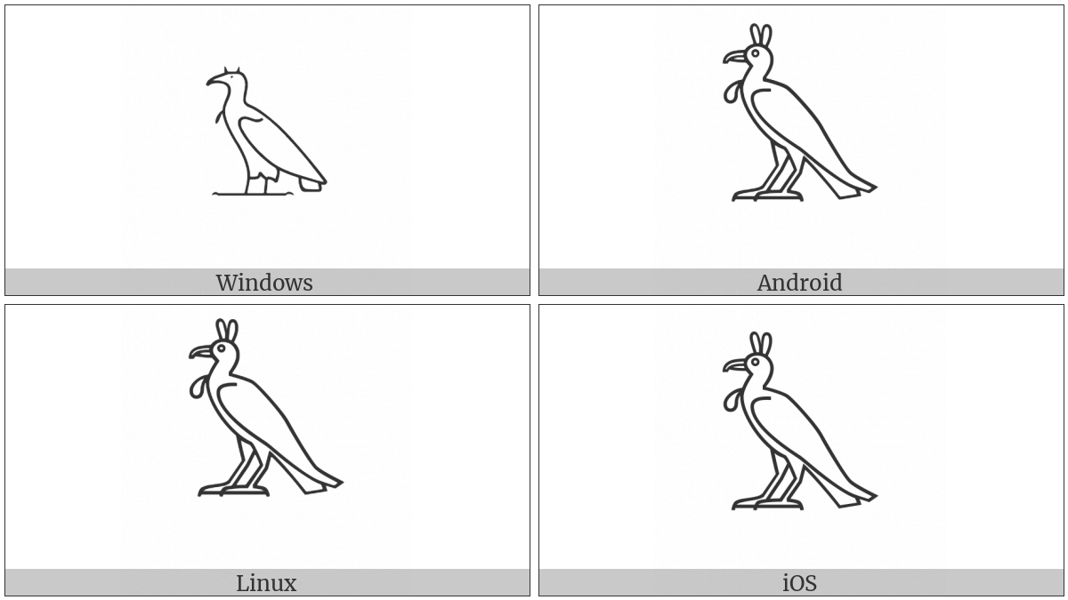 The image below shows how the “Egyptian Hieroglyph G021” symbol might look like on different operating systems. If the font in which this web site is displayed does not contain the symbol and there is no fallback font able to render it, you can use the image below to get an idea of what it should look like.