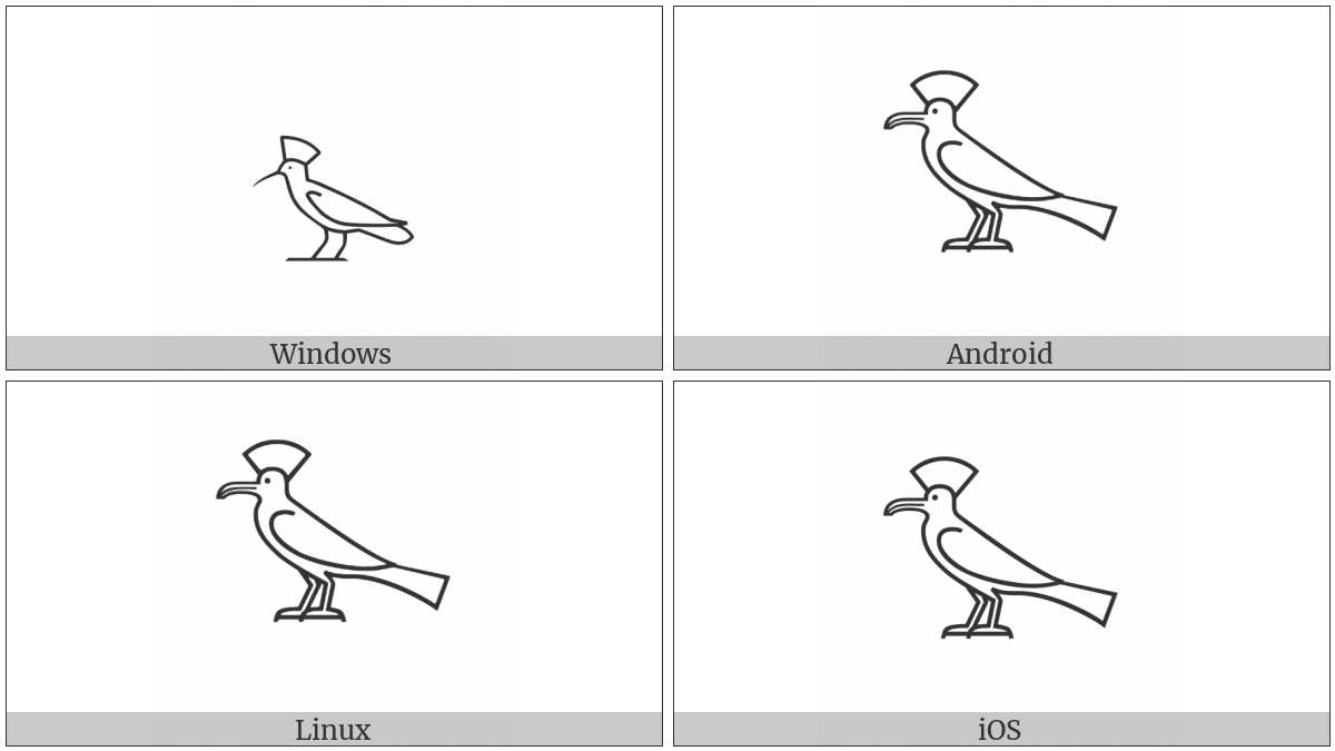 The image below shows how the “Egyptian Hieroglyph G022” symbol might look like on different operating systems. If the font in which this web site is displayed does not contain the symbol and there is no fallback font able to render it, you can use the image below to get an idea of what it should look like.