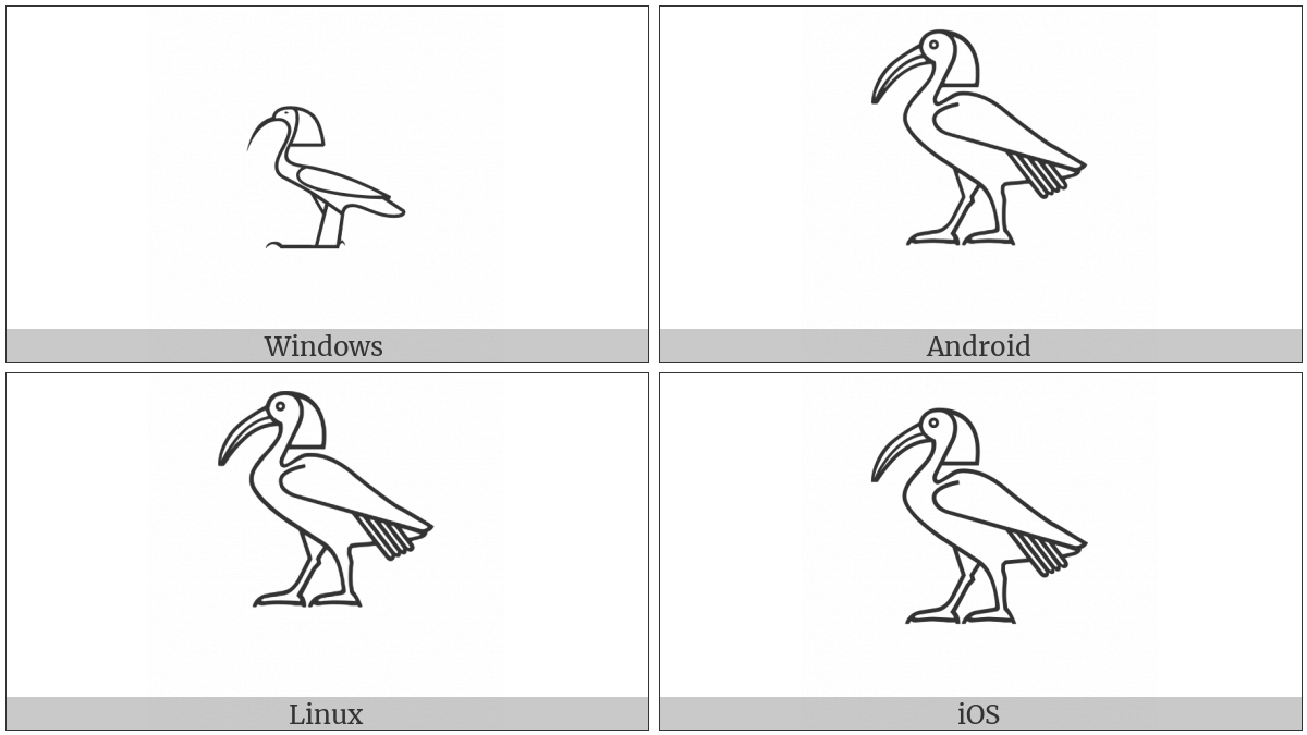 The image below shows how the “Egyptian Hieroglyph G025” symbol might look like on different operating systems. If the font in which this web site is displayed does not contain the symbol and there is no fallback font able to render it, you can use the image below to get an idea of what it should look like.