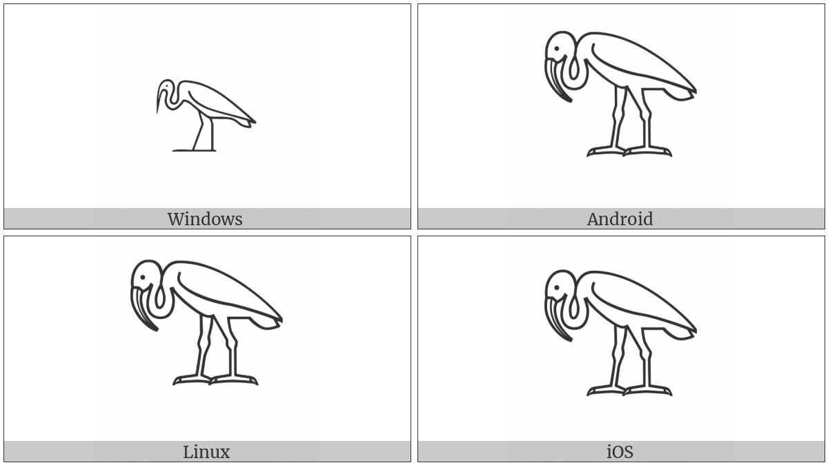 The image below shows how the “Egyptian Hieroglyph G027” symbol might look like on different operating systems. If the font in which this web site is displayed does not contain the symbol and there is no fallback font able to render it, you can use the image below to get an idea of what it should look like.