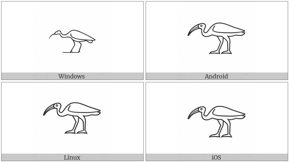 The image below shows how the “Egyptian Hieroglyph G028” symbol might look like on different operating systems. If the font in which this web site is displayed does not contain the symbol and there is no fallback font able to render it, you can use the image below to get an idea of what it should look like.