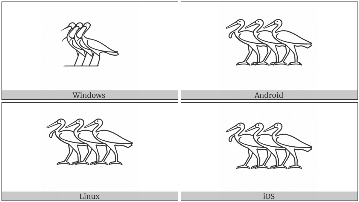 The image below shows how the “Egyptian Hieroglyph G030” symbol might look like on different operating systems. If the font in which this web site is displayed does not contain the symbol and there is no fallback font able to render it, you can use the image below to get an idea of what it should look like.