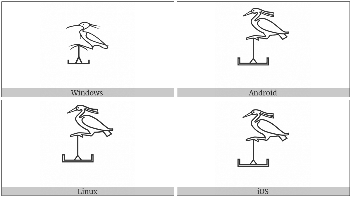 The image below shows how the “Egyptian Hieroglyph G032” symbol might look like on different operating systems. If the font in which this web site is displayed does not contain the symbol and there is no fallback font able to render it, you can use the image below to get an idea of what it should look like.