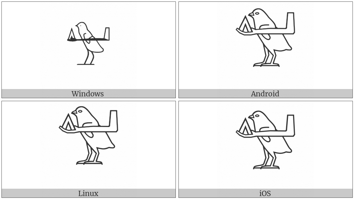 The image below shows how the “Egyptian Hieroglyph G045A” symbol might look like on different operating systems. If the font in which this web site is displayed does not contain the symbol and there is no fallback font able to render it, you can use the image below to get an idea of what it should look like.