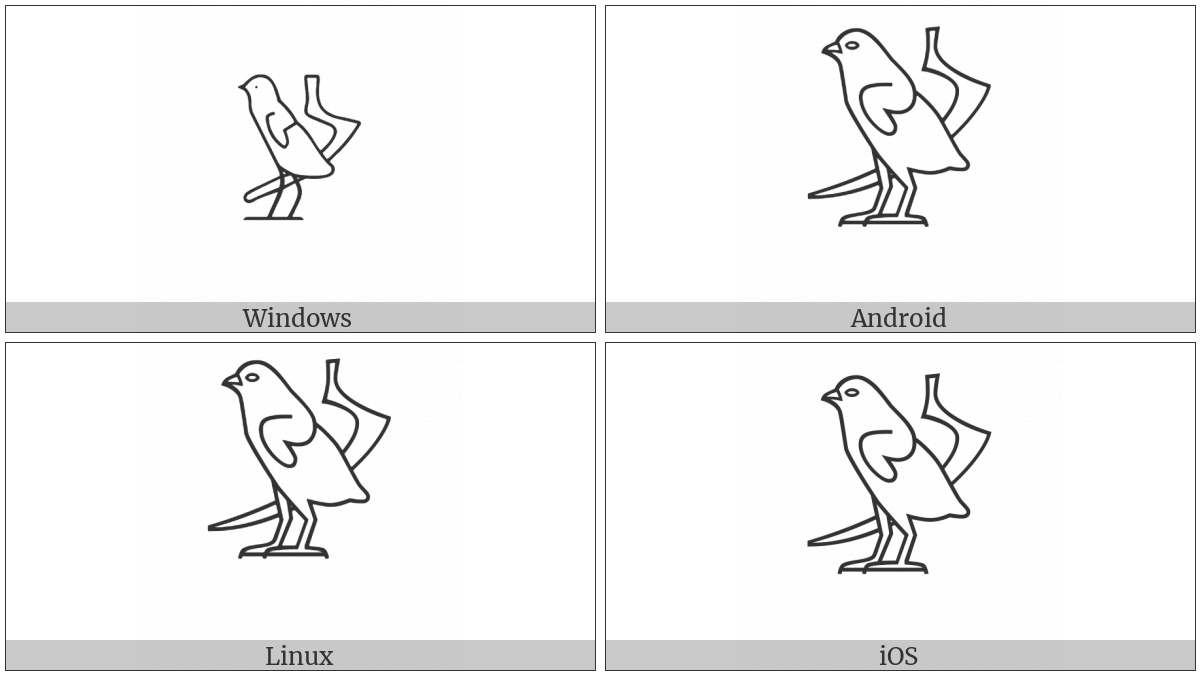 The image below shows how the “Egyptian Hieroglyph G046” symbol might look like on different operating systems. If the font in which this web site is displayed does not contain the symbol and there is no fallback font able to render it, you can use the image below to get an idea of what it should look like.