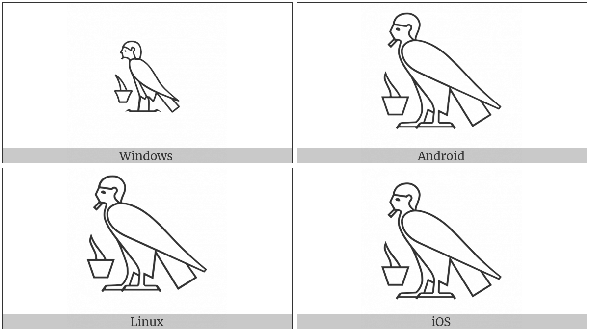 The image below shows how the “Egyptian Hieroglyph G053” symbol might look like on different operating systems. If the font in which this web site is displayed does not contain the symbol and there is no fallback font able to render it, you can use the image below to get an idea of what it should look like.