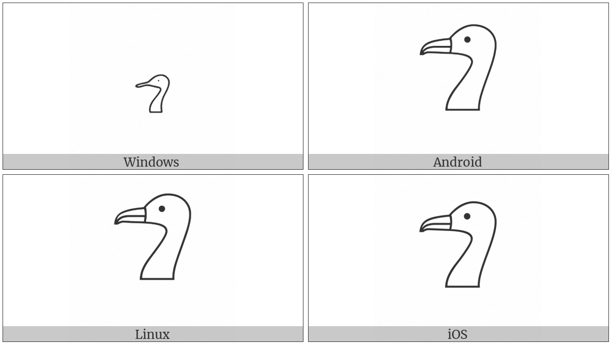 The image below shows how the “Egyptian Hieroglyph H001” symbol might look like on different operating systems. If the font in which this web site is displayed does not contain the symbol and there is no fallback font able to render it, you can use the image below to get an idea of what it should look like.