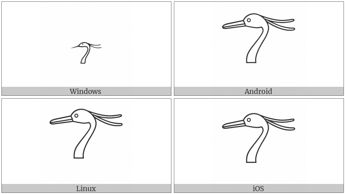 The image below shows how the “Egyptian Hieroglyph H002” symbol might look like on different operating systems. If the font in which this web site is displayed does not contain the symbol and there is no fallback font able to render it, you can use the image below to get an idea of what it should look like.