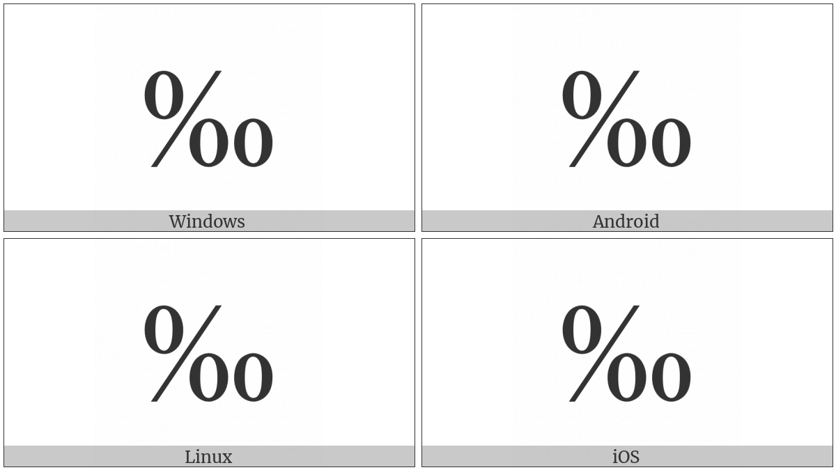 The image below shows how the “Per Mille Sign” symbol might look like on different operating systems. If the font in which this web site is displayed does not contain the symbol and there is no fallback font able to render it, you can use the image below to get an idea of what it should look like.
