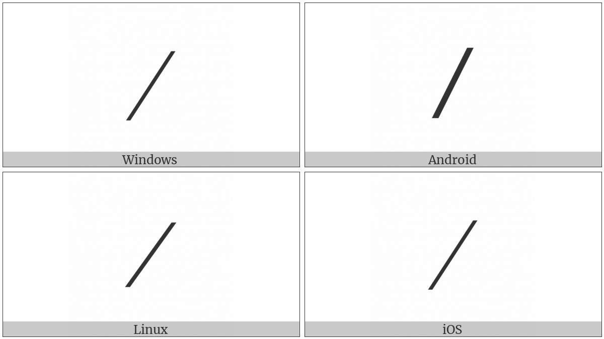 The image below shows how the “Fraction Slash” symbol might look like on different operating systems. If the font in which this web site is displayed does not contain the symbol and there is no fallback font able to render it, you can use the image below to get an idea of what it should look like.
