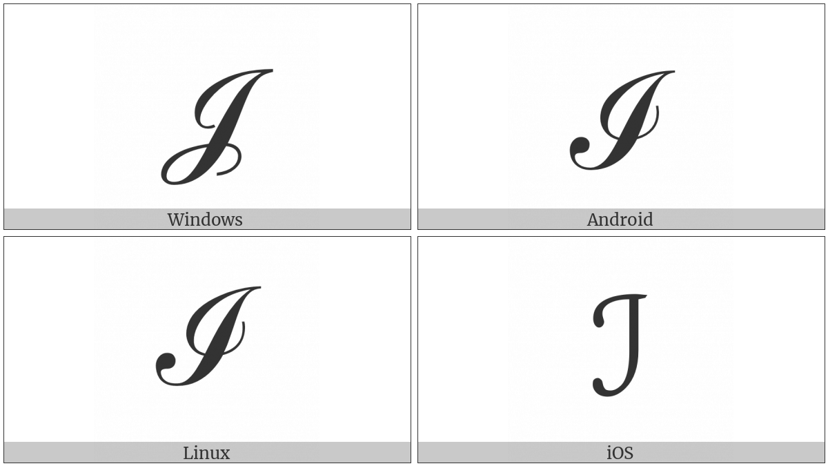 The image below shows how the “Script Capital I” symbol might look like on different operating systems. If the font in which this web site is displayed does not contain the symbol and there is no fallback font able to render it, you can use the image below to get an idea of what it should look like.