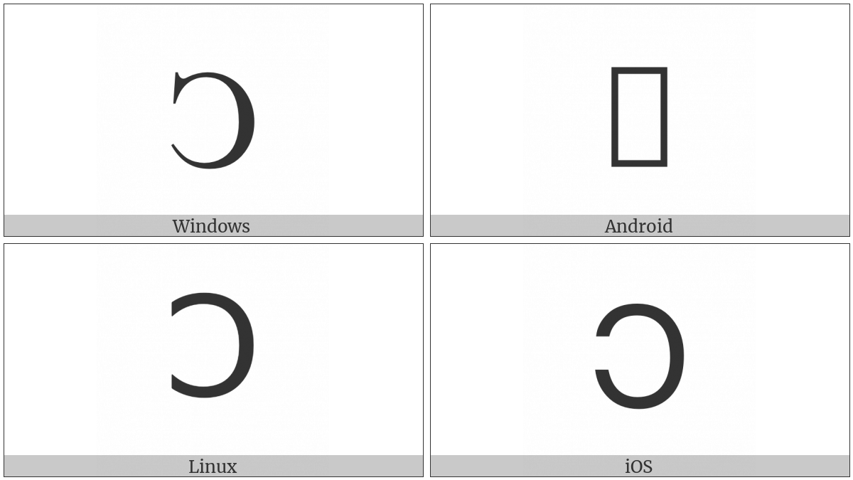 The image below shows how the “Roman Numeral Reversed One Hundred” symbol might look like on different operating systems. If the font in which this web site is displayed does not contain the symbol and there is no fallback font able to render it, you can use the image below to get an idea of what it should look like.