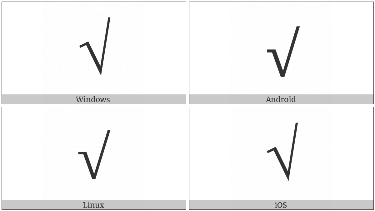 The image below shows how the “Square Root” symbol might look like on different operating systems. If the font in which this web site is displayed does not contain the symbol and there is no fallback font able to render it, you can use the image below to get an idea of what it should look like.