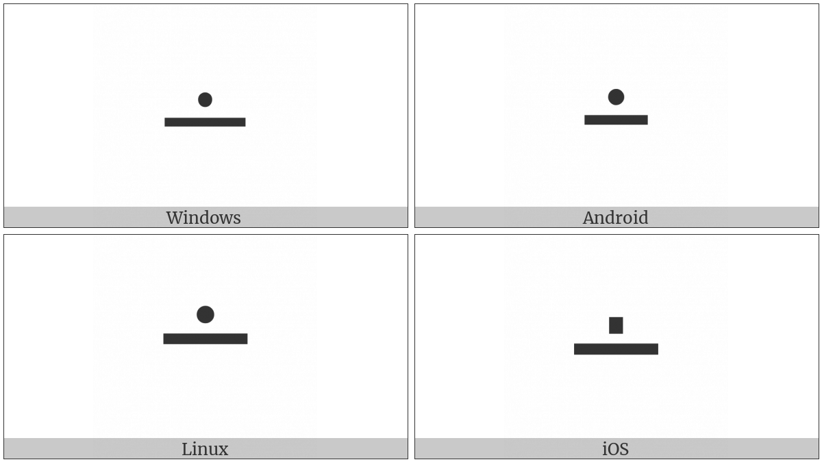 The image below shows how the “Dot Minus” symbol might look like on different operating systems. If the font in which this web site is displayed does not contain the symbol and there is no fallback font able to render it, you can use the image below to get an idea of what it should look like.