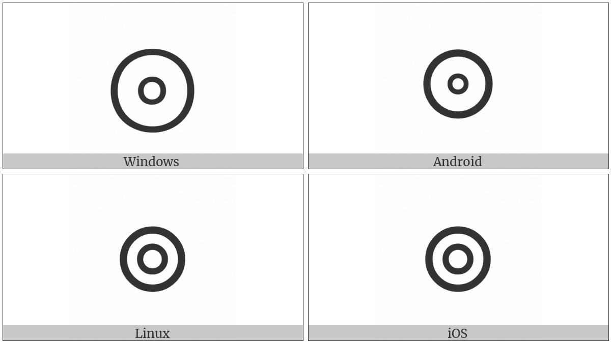 The image below shows how the “Circled Ring Operator” symbol might look like on different operating systems. If the font in which this web site is displayed does not contain the symbol and there is no fallback font able to render it, you can use the image below to get an idea of what it should look like.