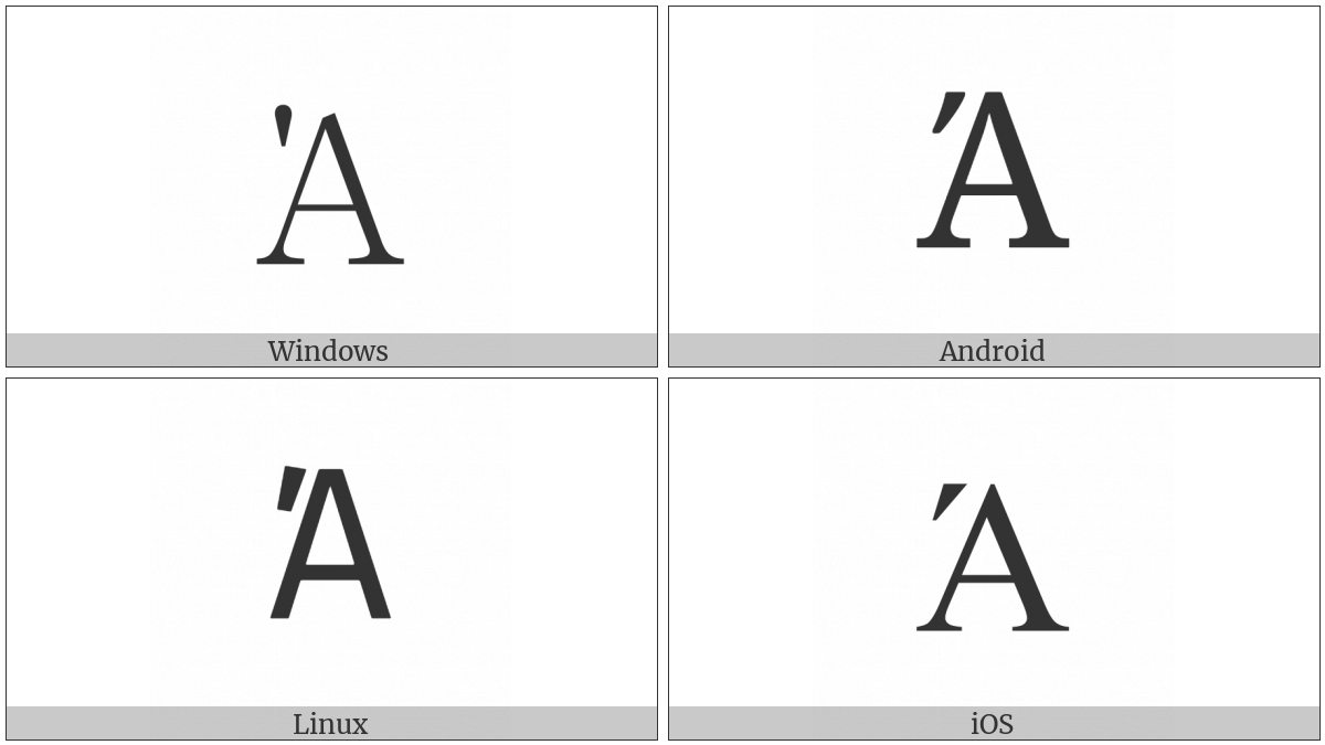 The image below shows how the “Greek Capital Letter Alpha With Tonos” symbol might look like on different operating systems. If the font in which this web site is displayed does not contain the symbol and there is no fallback font able to render it, you can use the image below to get an idea of what it should look like.