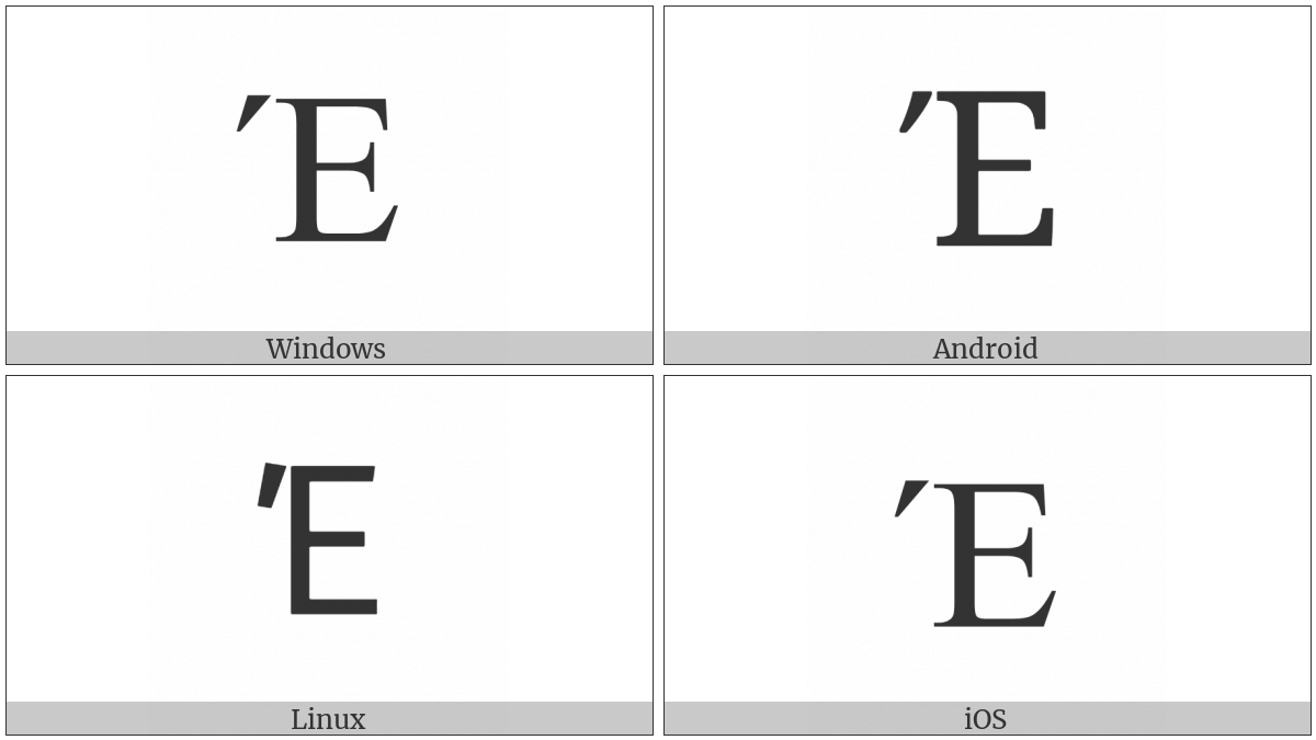 The image below shows how the “Greek Capital Letter Epsilon With Tonos” symbol might look like on different operating systems. If the font in which this web site is displayed does not contain the symbol and there is no fallback font able to render it, you can use the image below to get an idea of what it should look like.