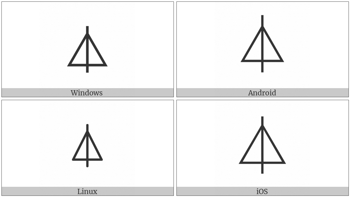 The image below shows how the “Dentistry Symbol Light Vertical With Triangle” symbol might look like on different operating systems. If the font in which this web site is displayed does not contain the symbol and there is no fallback font able to render it, you can use the image below to get an idea of what it should look like.