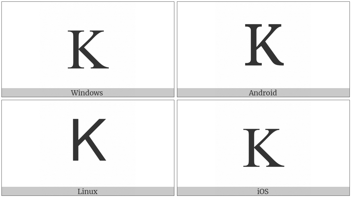 The image below shows how the “Greek Capital Letter Kappa” symbol might look like on different operating systems. If the font in which this web site is displayed does not contain the symbol and there is no fallback font able to render it, you can use the image below to get an idea of what it should look like.