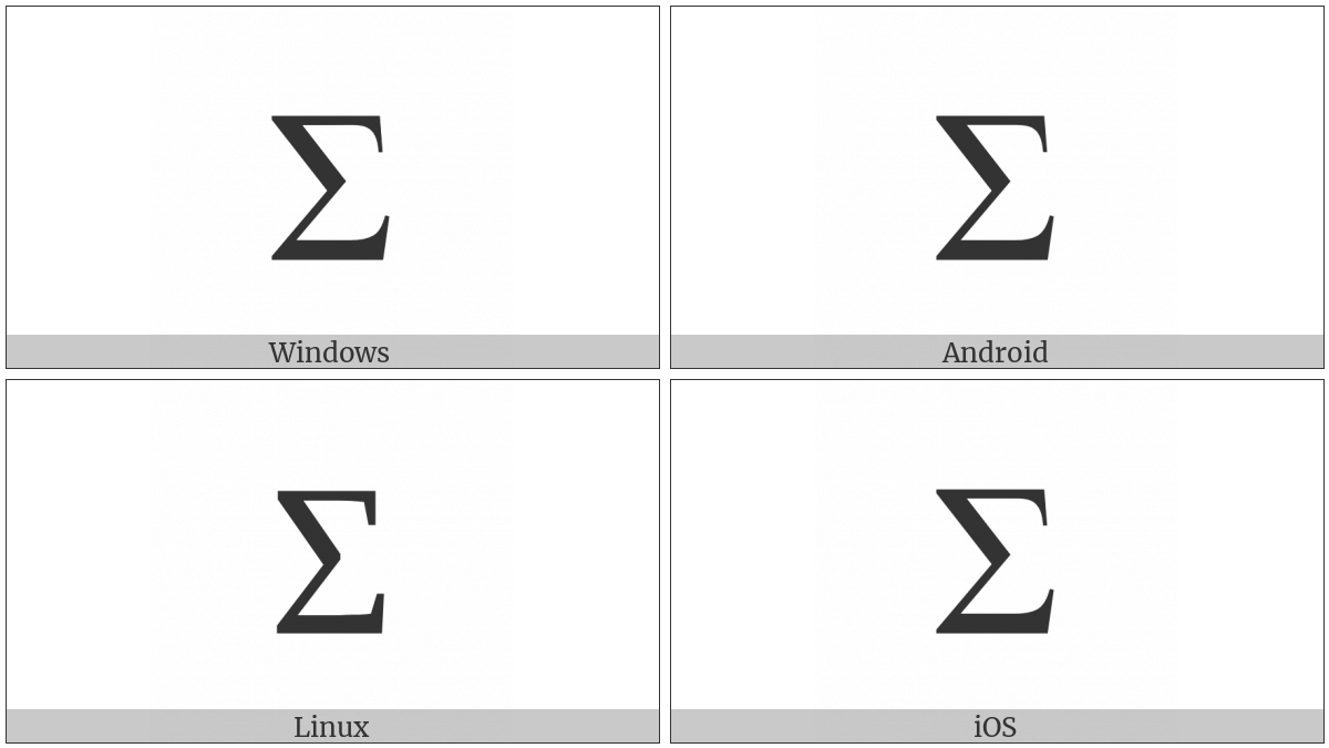 The image below shows how the “Greek Capital Letter Sigma” symbol might look like on different operating systems. If the font in which this web site is displayed does not contain the symbol and there is no fallback font able to render it, you can use the image below to get an idea of what it should look like.