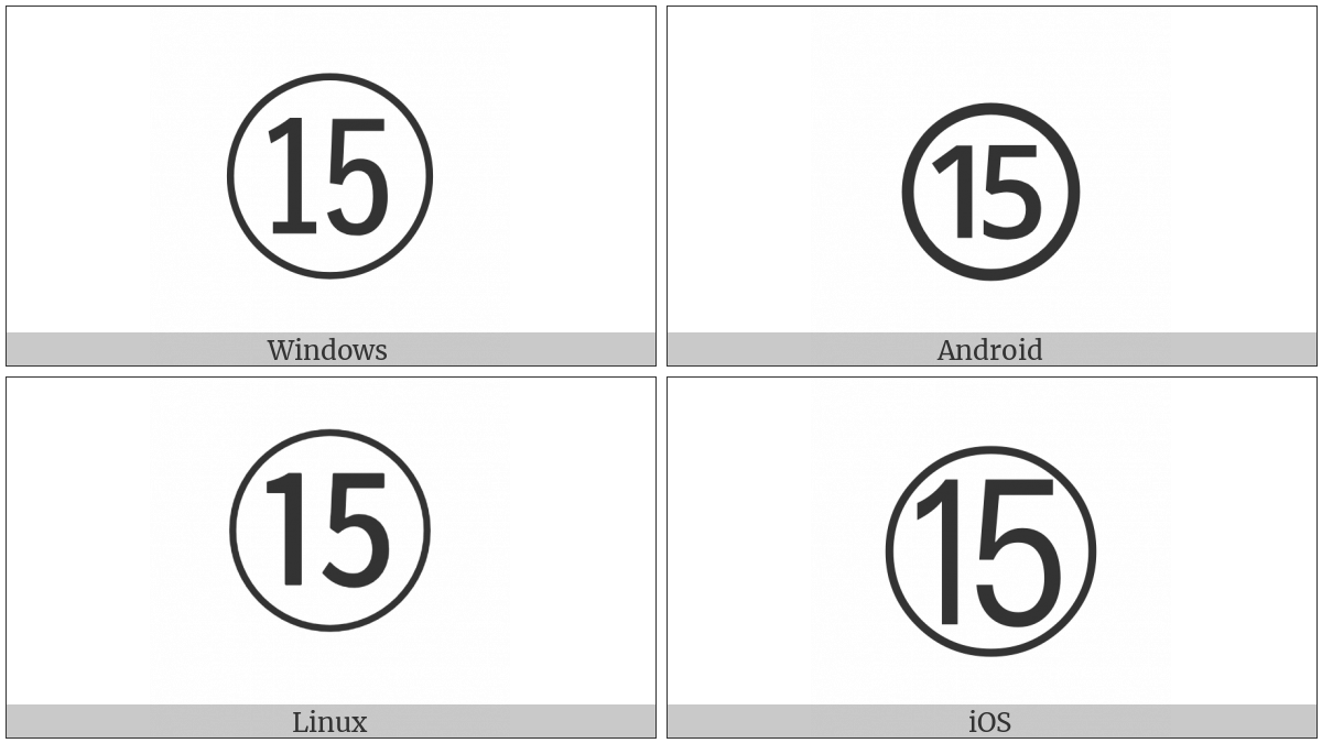 The image below shows how the “Circled Number Fifteen” symbol might look like on different operating systems. If the font in which this web site is displayed does not contain the symbol and there is no fallback font able to render it, you can use the image below to get an idea of what it should look like.