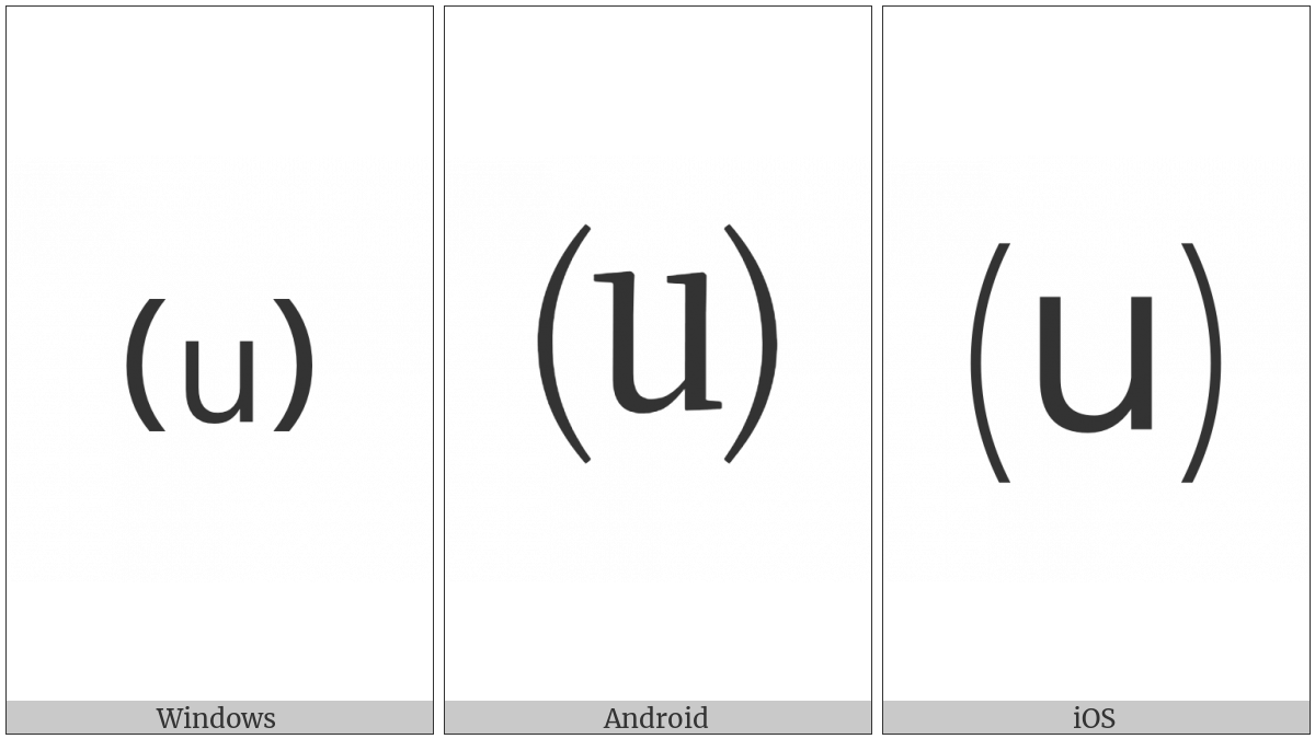 The image below shows how the “Parenthesized Latin Small Letter U” symbol might look like on different operating systems. If the font in which this web site is displayed does not contain the symbol and there is no fallback font able to render it, you can use the image below to get an idea of what it should look like.