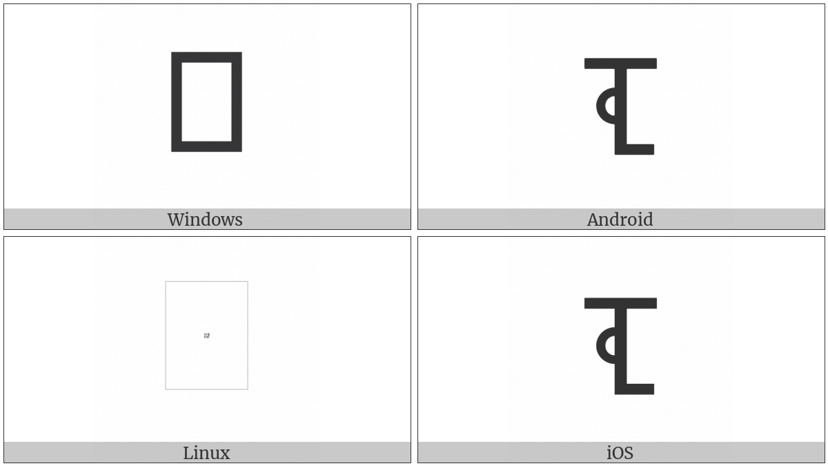 The image below shows how the “Miao Letter Dda” symbol might look like on different operating systems. If the font in which this web site is displayed does not contain the symbol and there is no fallback font able to render it, you can use the image below to get an idea of what it should look like.