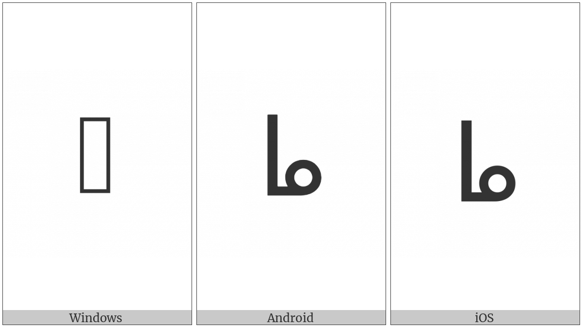 The image below shows how the “Miao Letter Lha” symbol might look like on different operating systems. If the font in which this web site is displayed does not contain the symbol and there is no fallback font able to render it, you can use the image below to get an idea of what it should look like.