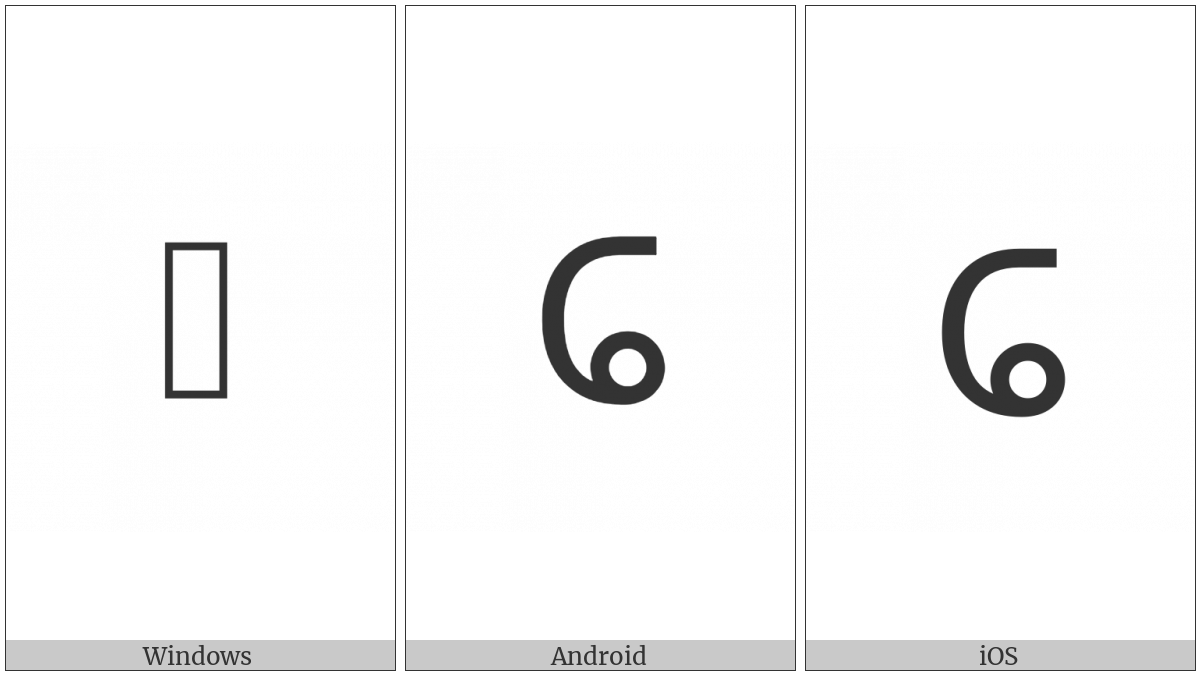 The image below shows how the “Miao Letter Nga” symbol might look like on different operating systems. If the font in which this web site is displayed does not contain the symbol and there is no fallback font able to render it, you can use the image below to get an idea of what it should look like.