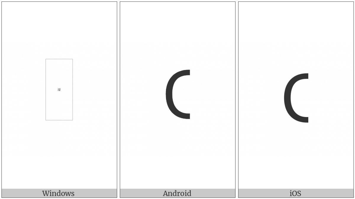 The image below shows how the “Miao Letter Nasalization” symbol might look like on different operating systems. If the font in which this web site is displayed does not contain the symbol and there is no fallback font able to render it, you can use the image below to get an idea of what it should look like.