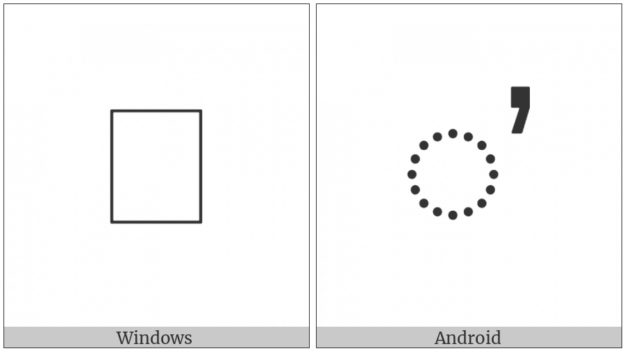 The image below shows how the “Miao Sign Aspiration” symbol might look like on different operating systems. If the font in which this web site is displayed does not contain the symbol and there is no fallback font able to render it, you can use the image below to get an idea of what it should look like.