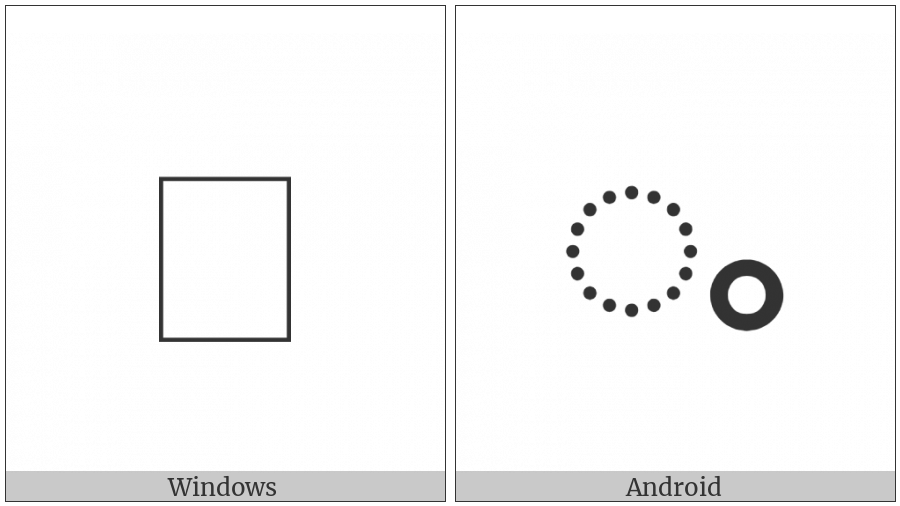 The image below shows how the “Miao Vowel Sign O” symbol might look like on different operating systems. If the font in which this web site is displayed does not contain the symbol and there is no fallback font able to render it, you can use the image below to get an idea of what it should look like.