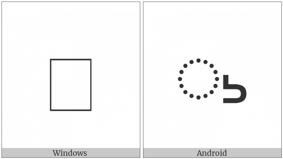 The image below shows how the “Miao Vowel Sign W” symbol might look like on different operating systems. If the font in which this web site is displayed does not contain the symbol and there is no fallback font able to render it, you can use the image below to get an idea of what it should look like.