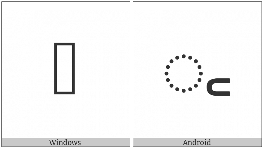 The image below shows how the “Miao Vowel Sign E” symbol might look like on different operating systems. If the font in which this web site is displayed does not contain the symbol and there is no fallback font able to render it, you can use the image below to get an idea of what it should look like.