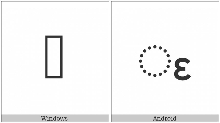 The image below shows how the “Miao Vowel Sign En” symbol might look like on different operating systems. If the font in which this web site is displayed does not contain the symbol and there is no fallback font able to render it, you can use the image below to get an idea of what it should look like.