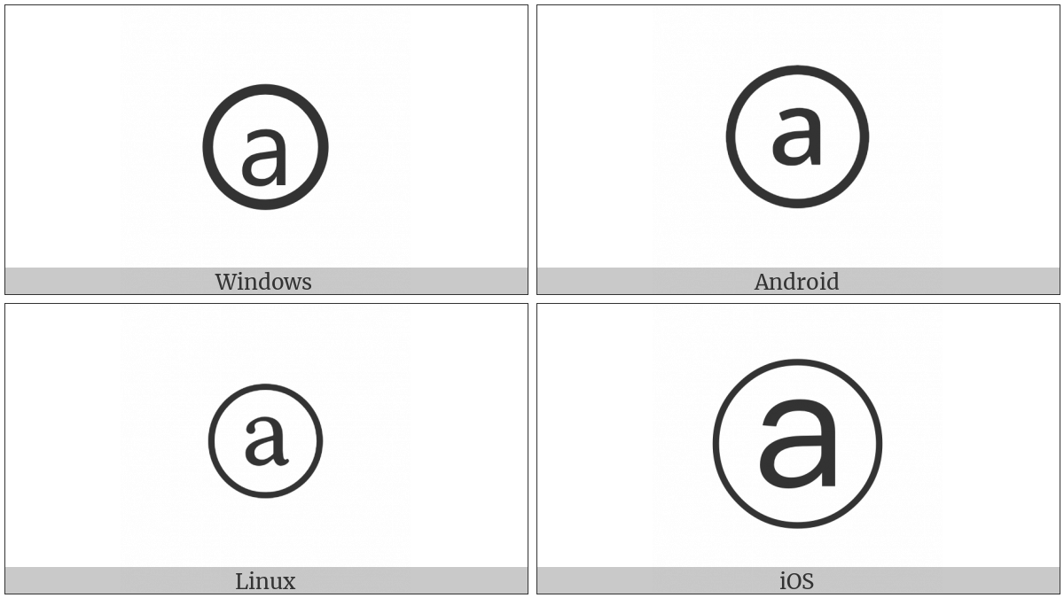 The image below shows how the “Circled Latin Small Letter A” symbol might look like on different operating systems. If the font in which this web site is displayed does not contain the symbol and there is no fallback font able to render it, you can use the image below to get an idea of what it should look like.
