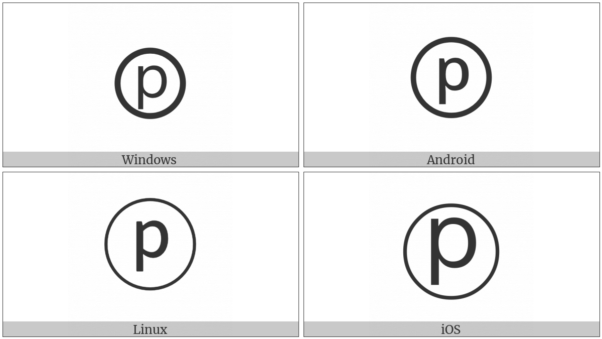 The image below shows how the “Circled Latin Small Letter P” symbol might look like on different operating systems. If the font in which this web site is displayed does not contain the symbol and there is no fallback font able to render it, you can use the image below to get an idea of what it should look like.