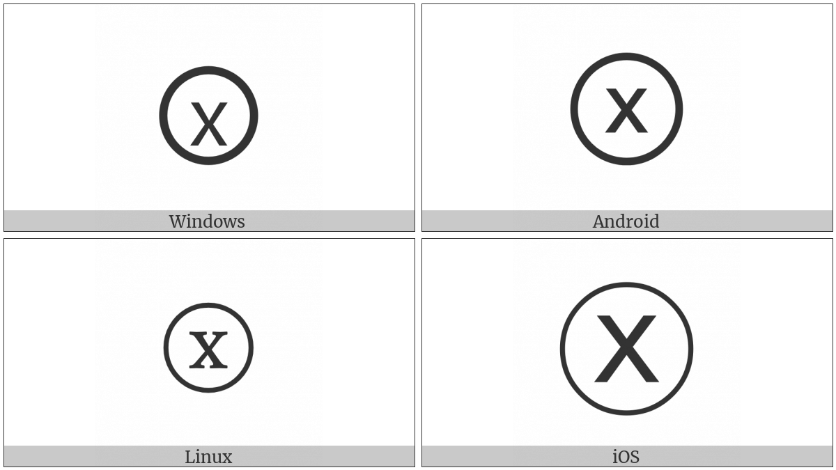 The image below shows how the “Circled Latin Small Letter X” symbol might look like on different operating systems. If the font in which this web site is displayed does not contain the symbol and there is no fallback font able to render it, you can use the image below to get an idea of what it should look like.