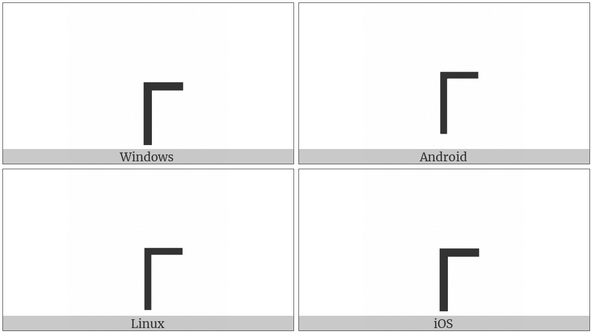 The image below shows how the “Box Drawings Light Down And Right” symbol might look like on different operating systems. If the font in which this web site is displayed does not contain the symbol and there is no fallback font able to render it, you can use the image below to get an idea of what it should look like.