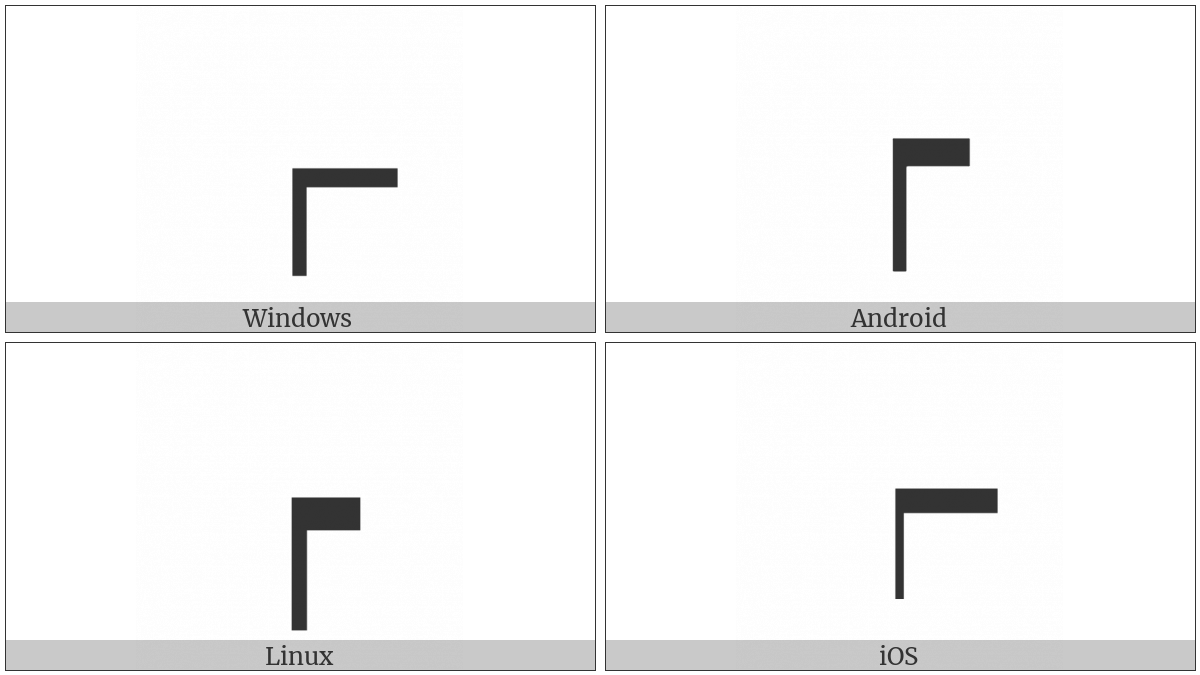 The image below shows how the “Box Drawings Down Light And Right Heavy” symbol might look like on different operating systems. If the font in which this web site is displayed does not contain the symbol and there is no fallback font able to render it, you can use the image below to get an idea of what it should look like.