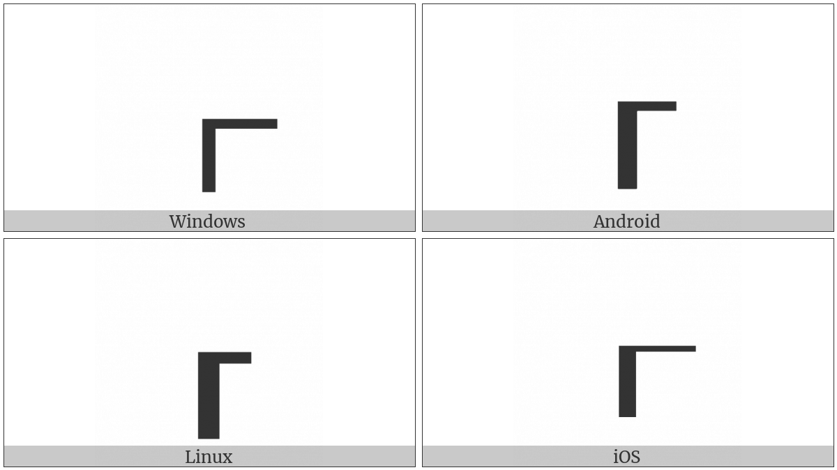 The image below shows how the “Box Drawings Down Heavy And Right Light” symbol might look like on different operating systems. If the font in which this web site is displayed does not contain the symbol and there is no fallback font able to render it, you can use the image below to get an idea of what it should look like.