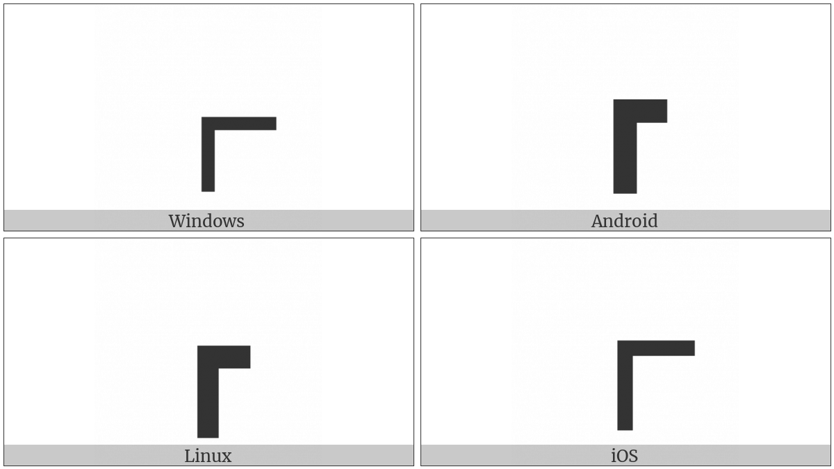 The image below shows how the “Box Drawings Heavy Down And Right” symbol might look like on different operating systems. If the font in which this web site is displayed does not contain the symbol and there is no fallback font able to render it, you can use the image below to get an idea of what it should look like.