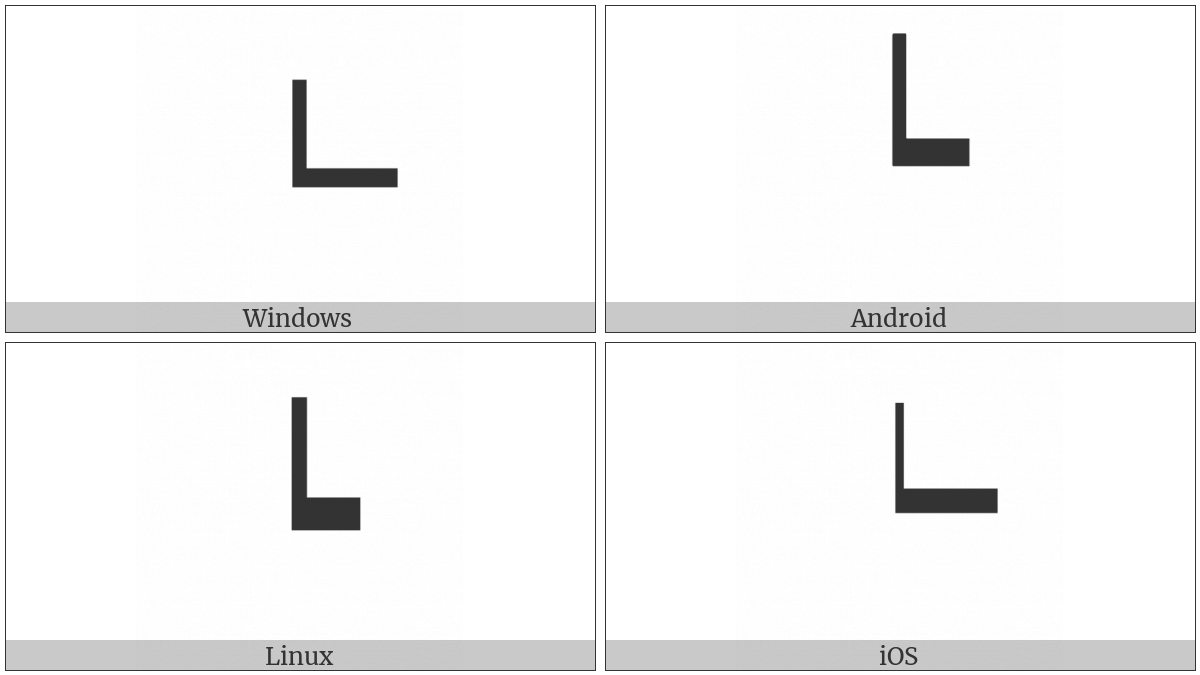 The image below shows how the “Box Drawings Up Light And Right Heavy” symbol might look like on different operating systems. If the font in which this web site is displayed does not contain the symbol and there is no fallback font able to render it, you can use the image below to get an idea of what it should look like.