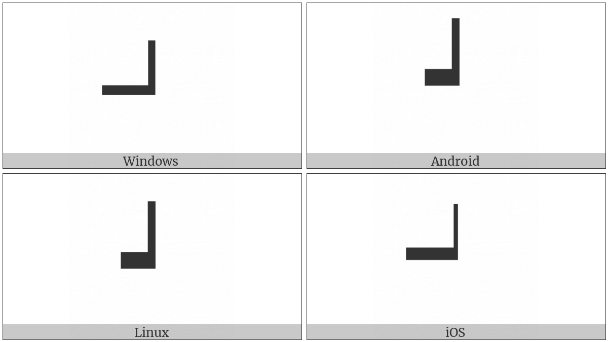 The image below shows how the “Box Drawings Up Light And Left Heavy” symbol might look like on different operating systems. If the font in which this web site is displayed does not contain the symbol and there is no fallback font able to render it, you can use the image below to get an idea of what it should look like.