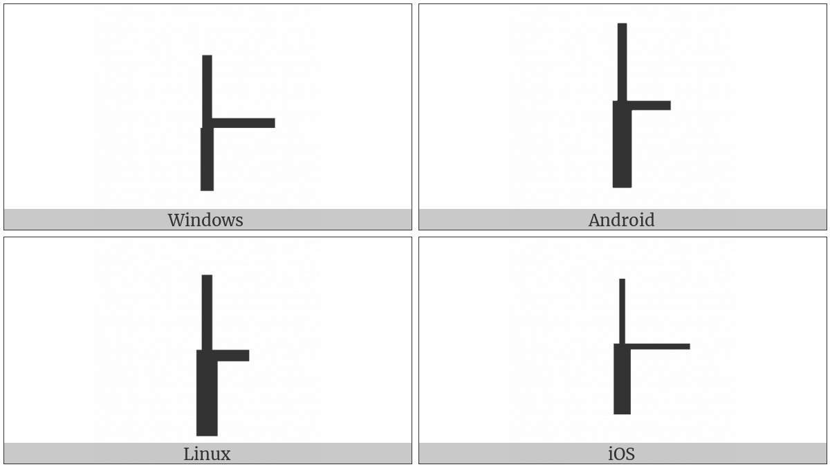 The image below shows how the “Box Drawings Down Heavy And Right Up Light” symbol might look like on different operating systems. If the font in which this web site is displayed does not contain the symbol and there is no fallback font able to render it, you can use the image below to get an idea of what it should look like.