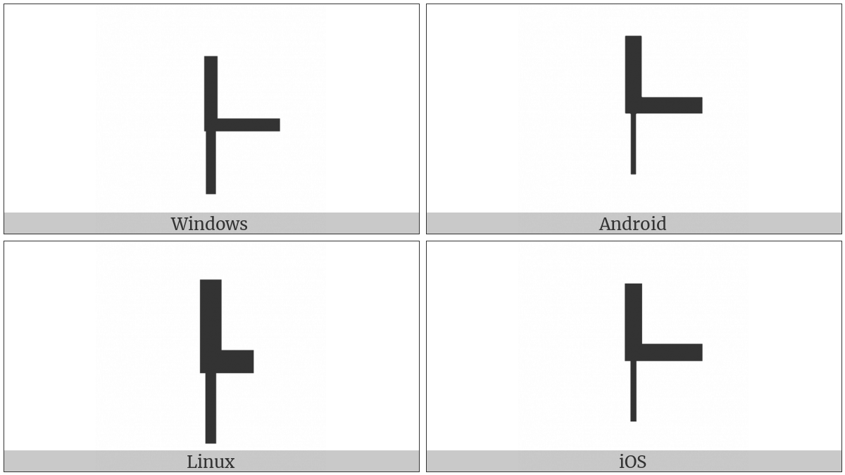 The image below shows how the “Box Drawings Down Light And Right Up Heavy” symbol might look like on different operating systems. If the font in which this web site is displayed does not contain the symbol and there is no fallback font able to render it, you can use the image below to get an idea of what it should look like.