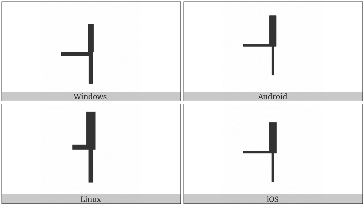 The image below shows how the “Box Drawings Up Heavy And Left Down Light” symbol might look like on different operating systems. If the font in which this web site is displayed does not contain the symbol and there is no fallback font able to render it, you can use the image below to get an idea of what it should look like.