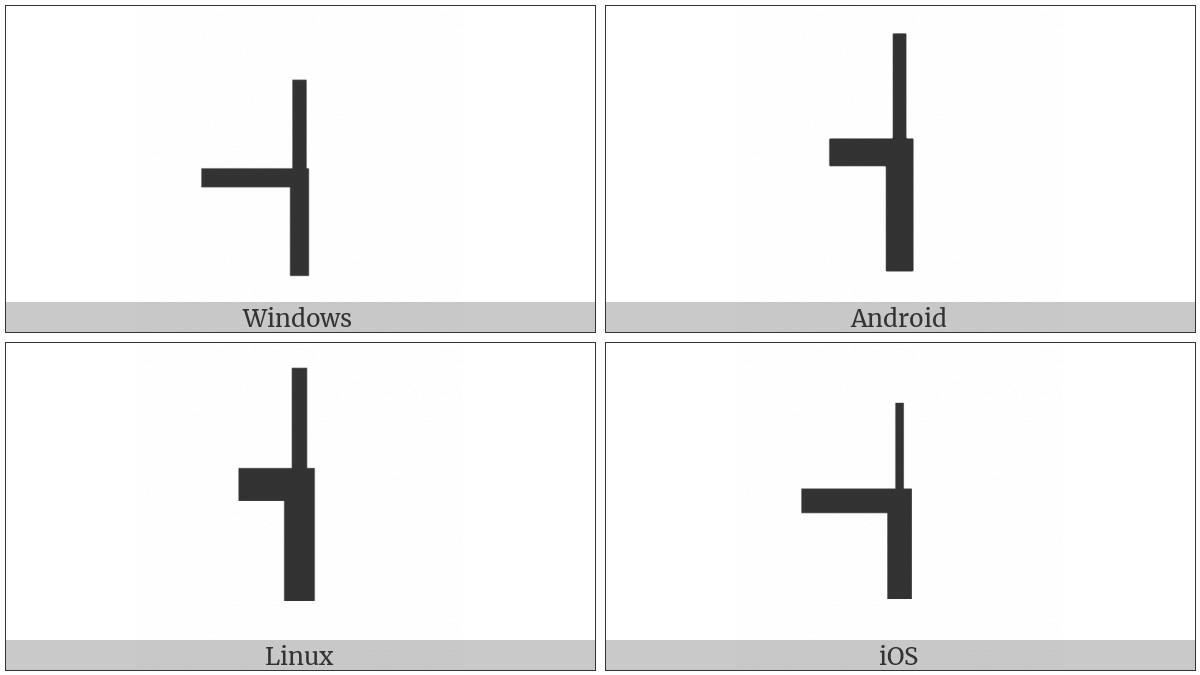 The image below shows how the “Box Drawings Up Light And Left Down Heavy” symbol might look like on different operating systems. If the font in which this web site is displayed does not contain the symbol and there is no fallback font able to render it, you can use the image below to get an idea of what it should look like.