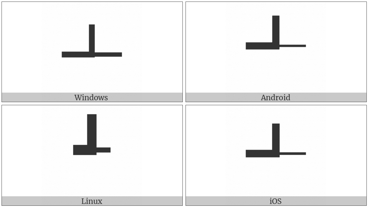The image below shows how the “Box Drawings Right Light And Left Up Heavy” symbol might look like on different operating systems. If the font in which this web site is displayed does not contain the symbol and there is no fallback font able to render it, you can use the image below to get an idea of what it should look like.